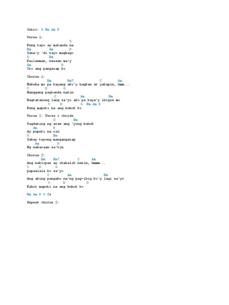 D DM7 Em A x2 Strumming. G C C7 Hanggang pag tanda natin F Nagtatanong lang sayo Dm Em ako pa kayay ibigin mo A7 F G Kung maputi na ang C Em Dm G7 buhok ko Verse 2. C D G Ipapaalala ko sayo C Am Bm Ang ating pangako na ang pag-ibig koy laging sayo C D G Kahit maputi na ang buhok ko Bm - C - D G - Bm - D G The time will come when your hairs white Bm And I dont have mine C D Well laugh about those things G Bm When we dream of the past itll come right back C D Like the flowers every spring Bm D C Am They wont believe us Ill.